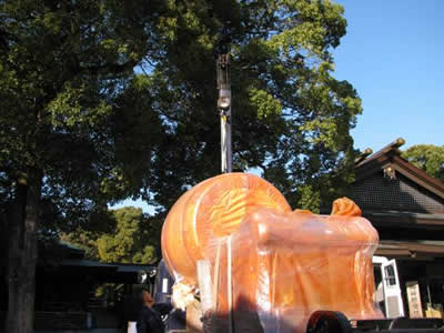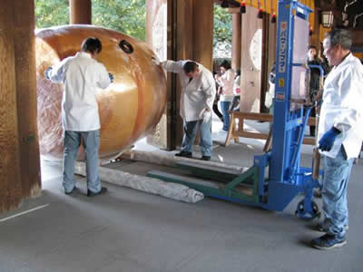 そんな中、6日は明治神宮に張替の太鼓を納品してきました。昭和55年にお納めした5尺の大太鼓ですが、今年の元旦に初詣客に一般開放した際、予想をはるかに超えた人々が押し寄せて太鼓を打ったために革が破れてしまったのでした。ニュースによると今年は明治神宮だけでなく、商売繁盛の神様として有名な神田明神をはじめ、全国の神社で例年以上の人出を数えたとのこと。不景気が深まる中で迎えた正月、神頼みにすがる人がいかに多かったかということでしょう。