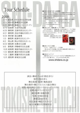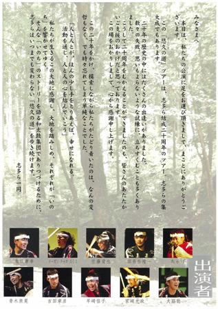 フィナーレの幕が下りた瞬間、心の底からこみ上げてきた感想はただ一つ「よくやった!」。表現するという行為、舞台の上での一人一人の責任と覚悟。それらがひしひしと胸を打ち、点数をあげられるものなら120点をあげたいほどの出来栄えでした。20年の間に、よくぞここまで成長したものよ。前回の公演では辛辣なまでの言葉で彼らを叱咤激励した私でしたが、その時の弱点を克服し、新しい志多らに脱皮したことを見せつけられた今回の舞台。まさに脱帽です。どこか訥々(とつとつ)とした土の匂いがする志多らの公演、これから東海、中国地方を巡回するとのこと、ご当地の皆さん、どうかみてやってください。
