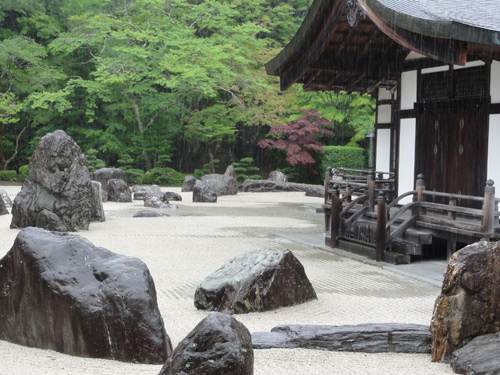 紀伊半島紀ノ川の南方で8弁の蓮の花びらにたとえられる峰々に囲まれた高野山は、標高約1000mの澄んだ空気がすがすがしく、目にするものすべてが厳かな雰囲気に包まれていました。あいにくの雨天でしたが、それだけに山深い木々の緑がいっそう鮮やかで、巡る寺々でお庭を拝見するのも楽しみの一つ。中でも金剛峯寺主殿の中庭「蟠龍庭(ばんりゅうてい)」や、無量光院の回遊池泉庭園は趣深く、自然と造形との組み合わせの妙に、思わずため息をついて見入るばかりでした。