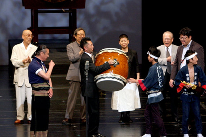今夏の猛暑は北海道にも及び、札幌や室蘭では観測史上初めて35度前後の暑さを記録したとのこと。そんな暑さの北海道で、心も熱くなるようなニュースを一つ。昭和42年、北海道の釧路市で結成された「北海道くしろ蝦夷太鼓保存会」が、地域における文化活動に顕著な功績のあった団体を顕彰する「サントリー地域文化賞」に選ばれ、8月4日、東京のサントリーホールで授賞式がおこなわれました。くしろ蝦夷太鼓の生みの親、石田榮一さんは40年以上にわたって釧路市に蝦夷太鼓を広める活動に尽力された功労者。今年89歳の高齢にもかかわらず、檀上でのごあいさつの立派なこと。太鼓界にもたらした貢献とともに、あらためて尊敬の念を強くした一幕でした。