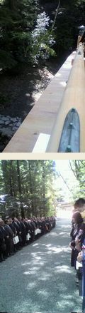 かねてより工事中だった伊勢神宮の内宮にある風日祈宮橋(かざひのみやばし)がこのほど竣工し、17日、お祝いの式典に招かれました。この橋は内宮神楽殿の南の方角にある、雨風の順調を司る神様がおられる風日祈宮に向かう途中、五十鈴川支流の島路川に架かる橋で、長さ45,6m、幅4,6m。内宮前の宇治橋を小さくしたような橋で、最初に架けられたのは室町時代の1498年とのこと。昨年、宇治橋の架け替え工事が終わったのにともない、今年の初めから新しい橋を架ける工事が進められていたものでした。